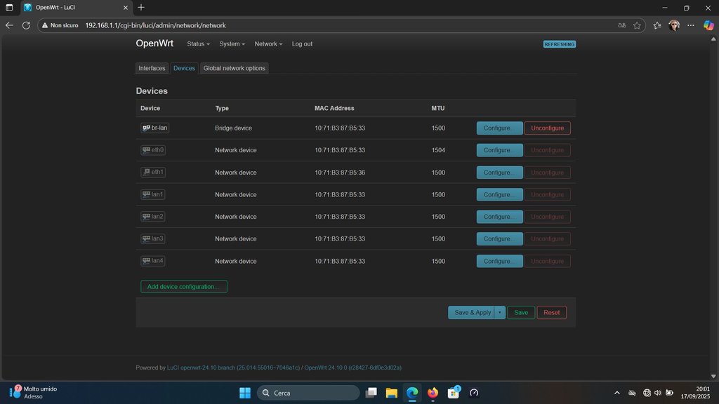 Il bridge br-lan dovrebbe unire le 4 porte lan1/lan4, a meno che per qualche motivo non includa anche la eth1 ma non credo, lo puoi controllare da "configure".