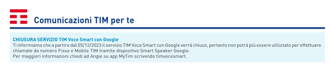 TIM ha iniziato (per motivi a me ignoti) la dismissione del servizio "TIM Voce Smart con Google", secondo la comunicazione ufficiale che i clienti TIM hanno ricevuto in fattura il servizo verrà dismesso a partire dal 05/12/2023.