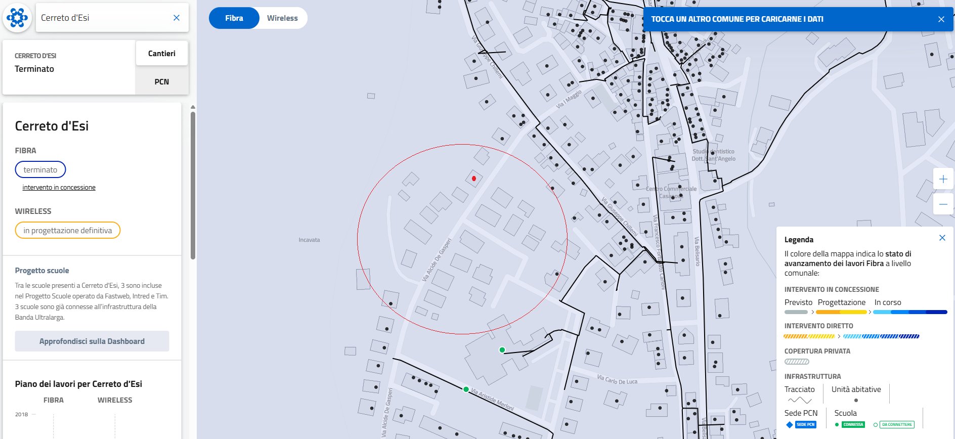 sto aprendo una FWA con Dimensione, il comune di Cerreto d'Esi risulta coperto da FTTH e nel mio caso arriva fino a due numeri civici di distanza, la mia abitazione è quella con la freccia, a fianco non hanno nulla e l'altra e quella coperta da fibra (Dimensione mi ha detto che al civico 10 è attivabile la FTTH ma non al civico 12 dove risiedo)