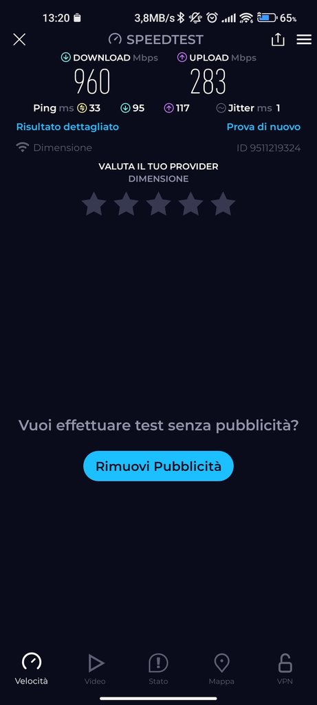 Questo qua sotto è il mio speedtest appena fatto con profilo 1000/300 con Dimensione, questo è quello che ti devi aspettare: