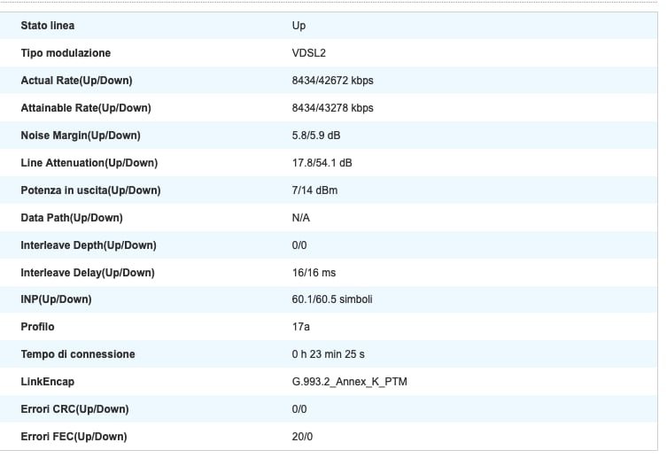 Entrando nel modem i valori sono sempre gli stessi di prima, 8mb Up e 42 in down, profilo 17a, è una VDSL2.