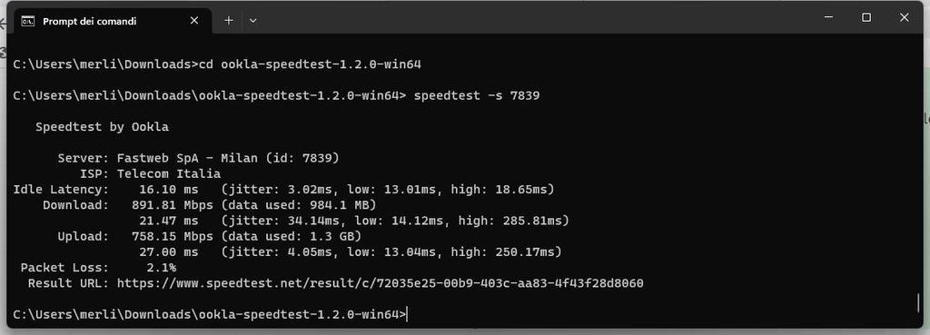 però facendo iltesto dal programma riga di comando di forumfibra..mi da questi risultati