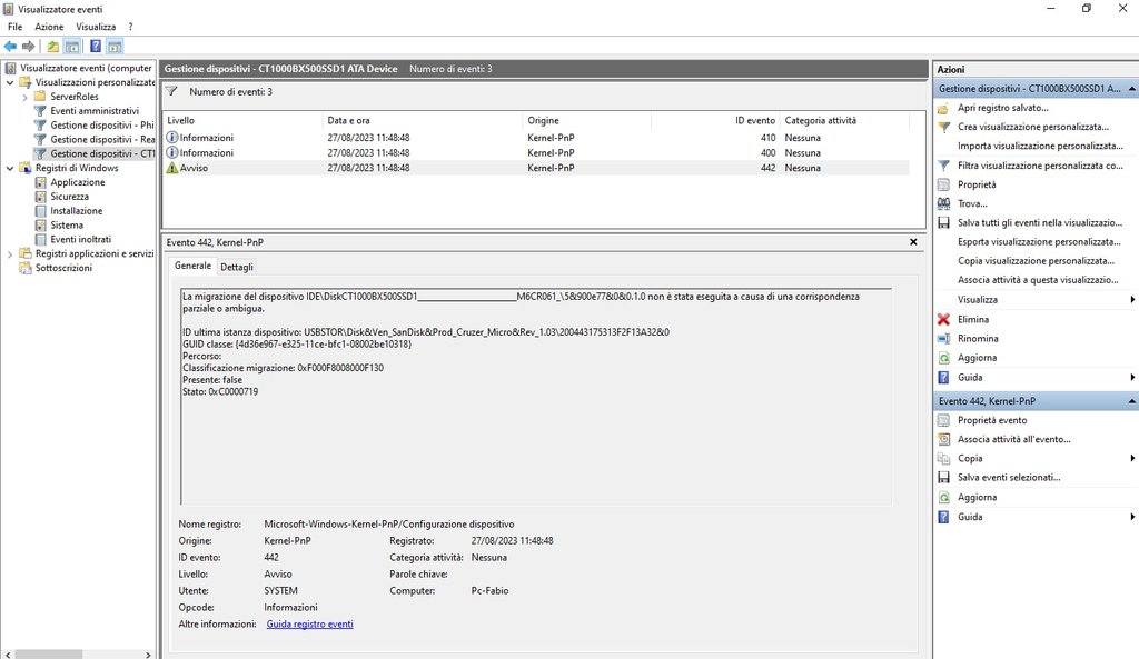 Non ho punti eslcamativi, però per il disco nuvo andando in Proprietà--> scheda Eventi ho trovato qualcosa che negli altri due dischi non c'è, andando su visualizza tutti gli eventi trovo questo. P.S. il 27 agosto 11:48 è quando ho acceso il pc dopo aver montato il disco.
