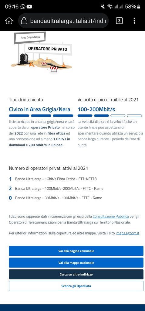 Buongiorno, scrivo perché ogni tanto controllo gli aggiornamenti dei vari siti per verificare l'arrivo della fibra ftth nel mio indirizzo (dove so per certo che nella mia città sono arrivati i lavori, perché li ho visti). Ho una buona fttc ma per lavoro ho bisogno anche di un buon upload e quindi cerco di aggiornarmi a tempo perso per capire se ho delle stime più o meno precise di quando avrò la possibilità di allacciarmi alla ftth, anche perché ho un contratto fastweb che mi garantirebbe fino a 2.5 gigabit/s. Allego lo screenshot dell'ultimo aggiornamento del sito banda ultra larga: