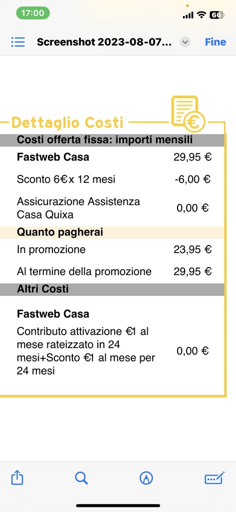 Antonio949494 ma che promo hai tu? Io sono rimasto con un operatore che nel caso in cui avessi i metodi di pagamento validi mi avrebbe fatto la nexxt casa (non la light e non fwa) a 23,90€ al mese a posto di 29,90€. Infatti avevo anche firmato il contratto per vedere se passasse il metodo di pagamento ma niente . Ti allego la parte del contratto
