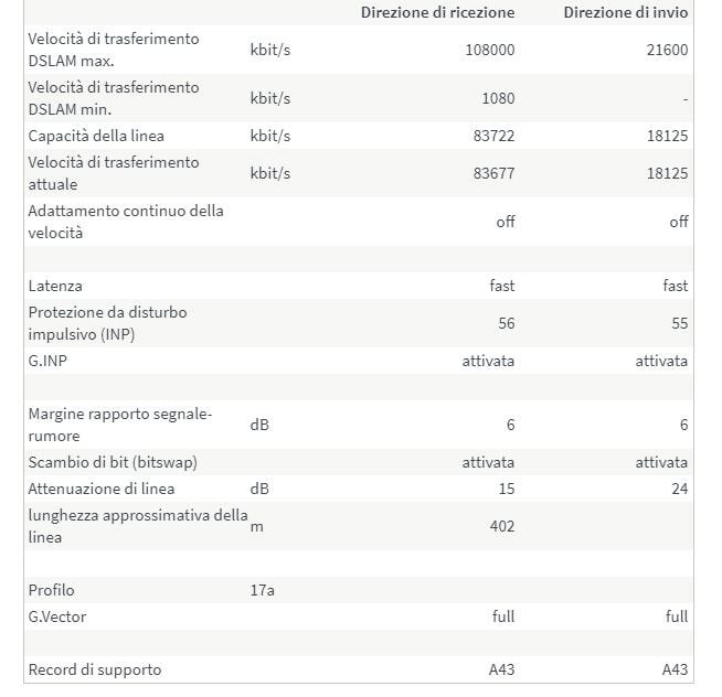 Considerando che il mio Fritz 7590 stima una distanza dal cabinet i circa 383 metri rispetto ai 421 reali (in questi due mesi sono calati man mano ma il salto maggiore è stato in seguito all'intervento giunto+centralino citato prima) dovrebbe essere segno che la connessione e la tratta è buona quindi sono qua a proporvi di seguito lo screen della connessione attuale dal quale si può supporre che mi sia stato attivato il profilo 12db+SOS anche perchè nell'ora che il tecnico ha operato sul cabinet sopra ha toccato e spostato cavi e mi sono visto la mia connessione resettata quindi probabilmente ha causato un allarme nei sistemi che mi ha fatto attivare quel profilo.