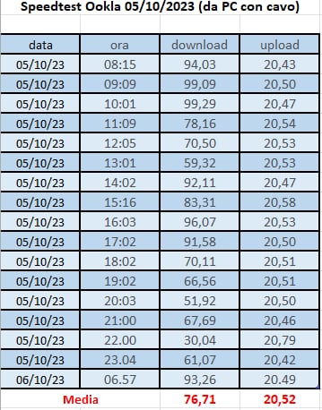 Ieri ho testato la linea, con connessione via cavo, lanciando lo speedtest Ookla ogni ora circa, con questi risultati: