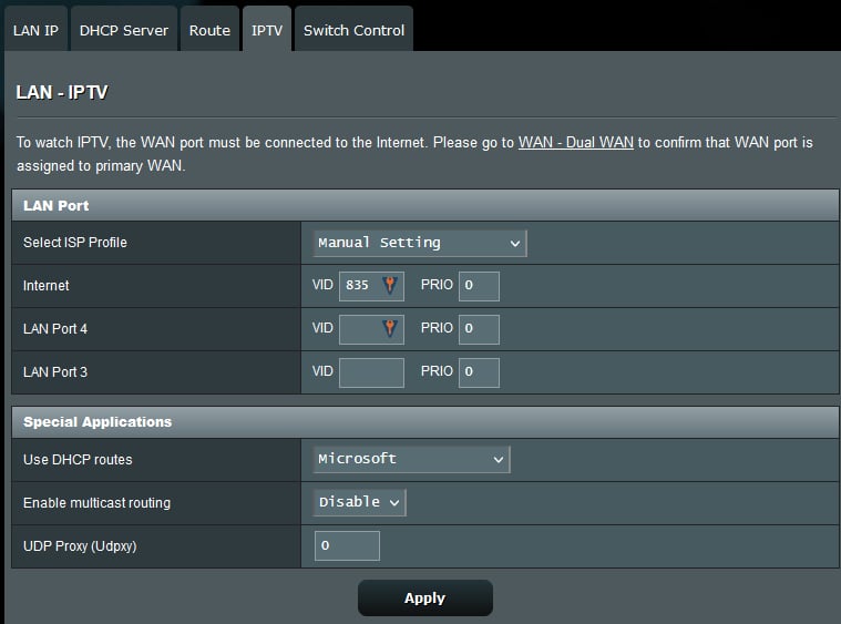 zor Nel mio RT-AX86U è (inspiegabilmente) sotto LAN > IPTV. Devi impostare in "LAN port" come "ISP profile" "Manual Setting" e mettere 835 nel VID Internet.
