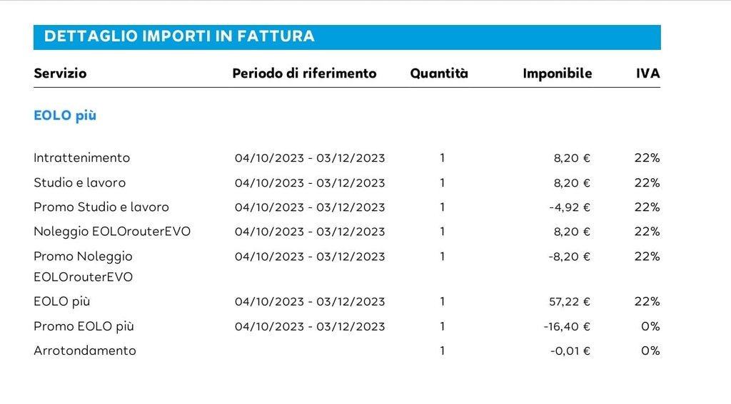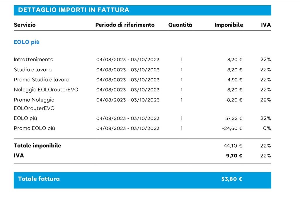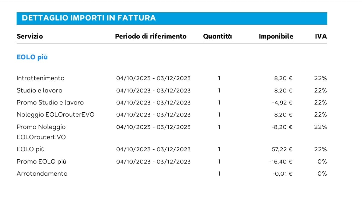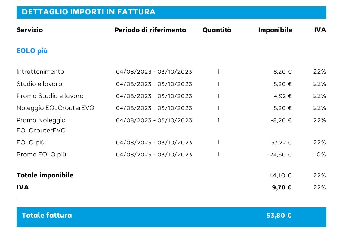 SalvatoreSolano Salve, è un'anno che ho Eolo 100,oggi mi è arrivata la solita fattura ma al posto di 53,80 è di 63,80.Scaduta la promozione valida per un'anno? Anche per voi è così? Grazie.