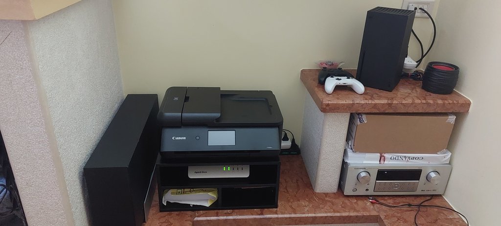 Nella seconda foto NON c'è assolutamente traccia di cavo alimentazione sinto-ampli, Xbox, stampante, modem, Subwoofer, HDMI Xbox, cavo audio canale LFE, cavi audio in uscita dei 5.1 canali dell'impianto HT, doppino telefonico DSL, doppino telefonico per Cordless.