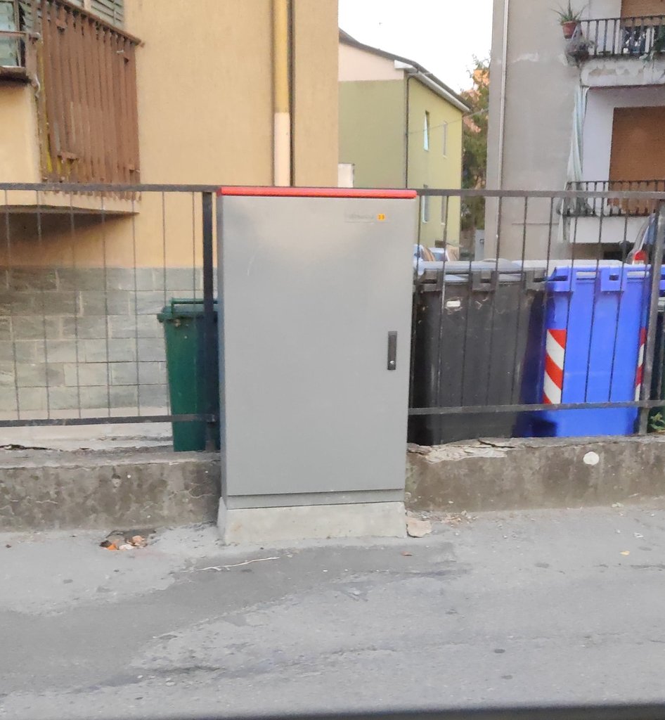 Prima di tutto, l'armadio 38 su cui sono attestato sembra essere stato espanso nell'ultimo anno, ne è stato installato uno nuovo sull'altro lato della strada rispetto al vecchio, con lo stesso numero del vecchio (38) e la scritta Fibercop: