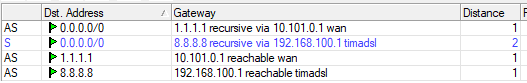 Come si osserva dalla tabella di routing, il Mikrotik tiene pingato 1.1.1.1 e 8.8.8.8 (che si spera non crollino mai insieme). Se una delle due fallisce e non riesce a ricevere risposte, significa che la connessione è down e switcha il traffico sull'altra, dinamicamente. Avevo già fatto una cosa anche con chiavetta ma eravamo ancora in "epoca" 3G ed ora è stata eliminata, ma non è nulla di differente da questo setup.