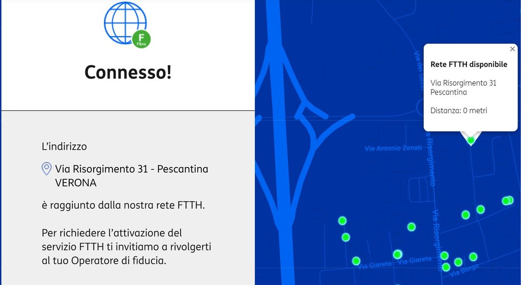 Cercando con il civico del mio vicino di casa, abitazione direttamente accanto al palo Telecom, questa risulta essere raggiungibile.