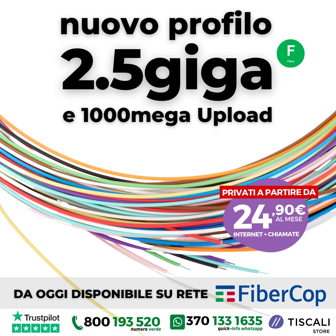 MicheleBandinu TISCALI ULTRAINTERNET FIBRA 2.5Giga su FiberCop In questi giorni viene reso disponile alla commercializzazione il nuovo profilo fino a 2.5 Gbps download e 1000 Mbps upload attivabile solo ed esclusivamente su rete FIBERCOP. Viene fornito come come Router ZTE ZXHN H6645P . Il profilo non incide in nessun modo sull'offerta commerciale, che prevede sempre la miglior connessione disponibile allo stesso prezzo, trovate l'offerta dedicata per gli utenti del Forum per privati qui. e ricordiamo che in alcune regioni sono disponibili ancora fondi per il contributo statale attivabili con i massimali ora anche sotto rete FIBERCOP info a questo LINK. Al momento non sono possibili Upgrade dei profili su contratti già attivi, daremo aggiornamenti prossimamente.