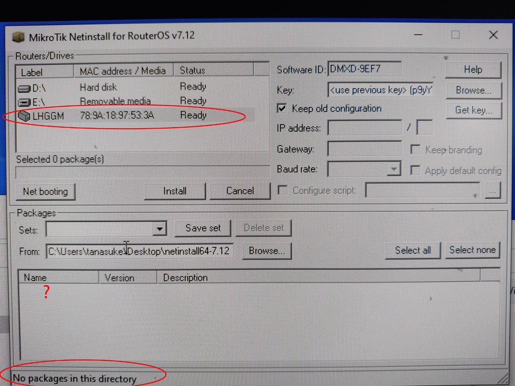 Grazie per la risposta... si ho letto e provato questi reset...Ho letto anche che si può utilizzare l'utility netinstall.Appena fatto la prova..La procedura sarebbe di premere il tasto reset prima di alimentare l'antenna,senza togliere il dito dal tasto reset alimentare l'antenna e tenere premuto sempre il tasto reset x 20/30 secondi.Fatto ,mi trova il router ma non scarica i pacchetti come si vede da questa foto (dovrebbero comparire sotto la voce NAME.