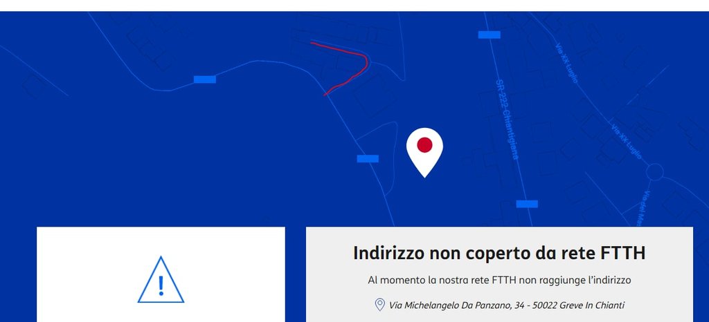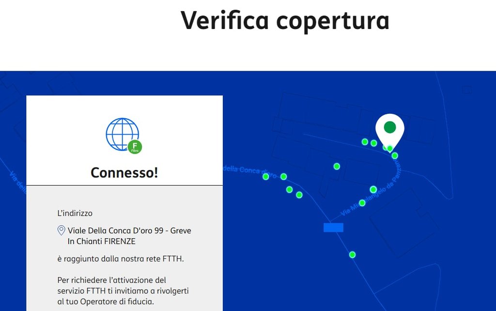 Buongiorno, avrei bisogno di un controllo penso da parte di qualcuno dei venditori TIM trattandosi di rete fibercop in quanto l'indirizzo VIA MICHELANGELO DA PANZANO n. 34 GREVE IN CHIANTI (FI) anche se dovrebbe essere abbondantemente coperto (posa rete di fibercop oltre un anno fa con PTE e tutto quanto già illuminati e attivati in zona) dalle ricerche che ho effettuato sui vari portali non risulta coperto.