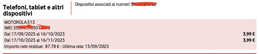 Il giorno 13/10/2023 mi sono recato in un negozio Vodafone per far cambiare la sim del telefono di mia figlia, costo 10€, sostituzione effettuata, tutto a posto. Già che c’ero gli ho chiesto se ci fossero offerte per me in quanto titolare di un contratto fibra e tre mobile e mi hanno offerto uno sconto sulla tariffa applicata a mio figlio da 25€ a 17€ con pagamento una tantum di 20€ circa a fine mese (ottobre) quando andrà in scadenza e mi ha dato, senza che lo chiedessi, un Motorola E e un selfie ring. Dato che non ne avevo bisogno, del telefono Motorola, ho chiesto se dovessi aspettarmi qualche addebito in fattura e il commesso mi ha detto assolutamente di no.