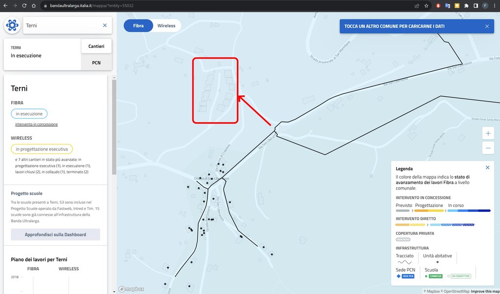 Scopriamo che esiste il sito nazionale dove si vedono i lavori per la fibra, indagando ulteriormente scopriamo che sono stati programmati già dal 2019 e scopriamo, guardando le mappe, che verrà connessa tutta l'area, fino a 100m da noi. Viene stesa la fibra per circa 200m anche verso il cimitero dove ci sono sì i cari defunti, ma nessuna abitazione! Scopriamo che viene portata fibra fino all'altezza del vicino parco, dove ci sono molte abitazioni ma tutte vuote da anni - sono abitazioni estive di stranieri.