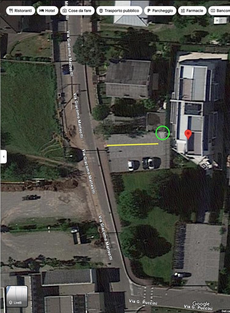 Si rende quindi obbligatorio l'allaccio da via Giacomo Matteotti, il che non sarebbe un problema se non fosse che non esiste nessuna conduttura che dal cancelletto dove risiedono i contatori della luce (segnato sulla foto con un cerchio verde) arrivi alla via per l'appunto.