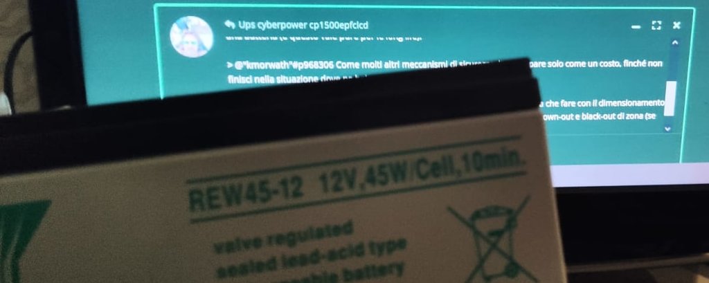 Ma questo ha relativamente meno a che fare con la scelta delle batterie (a parte il valore di W/cella): ha più a che fare con il dimensionamento dell'UPS (carico max), con la conoscenza pregressa sulla frequenza e durata di brown-out e black-out di zona (se non hai idea, vai un po' alla cieca).