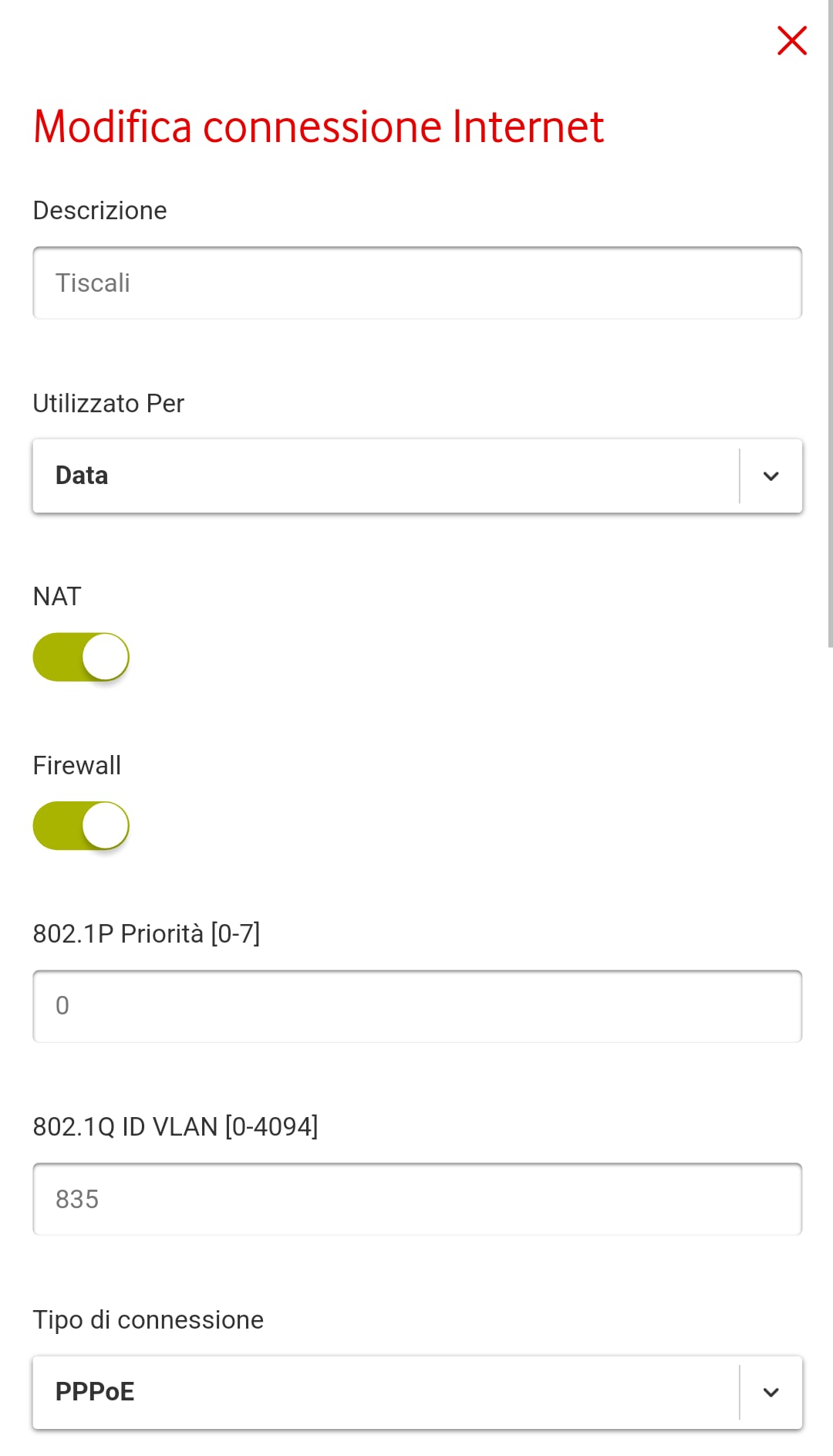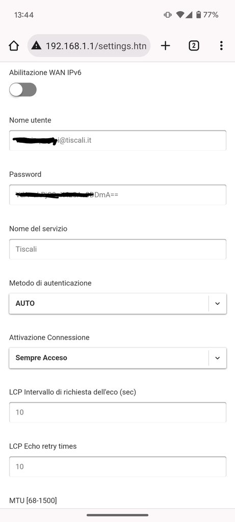 SatoxMan Alla fine ci sono riuscito. Ho impostato come consigliato, in modalità modem generico dal menù esperto. Ho inserito i seguenti parametri, dove l'username e psw è l'email tiscali e la relativa psw (non sono le credenziali del my Tiscali) Ringrazio @MicheleBandinu per il supporto. Infinite grazie