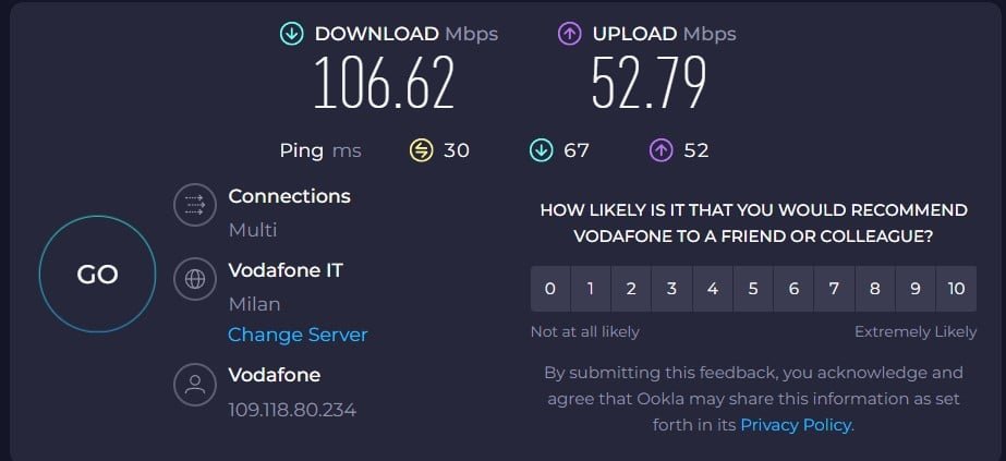speedtest su server Vodafone Milan, eseguito via cavo: