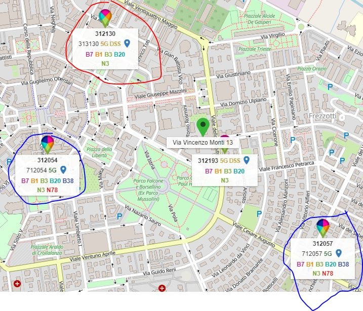 Ho la fortuna di essere vicino ad almeno 3 BTS Wind3 in 5G: il router aggancia a quella cerchiata in rosso (che è DSS).