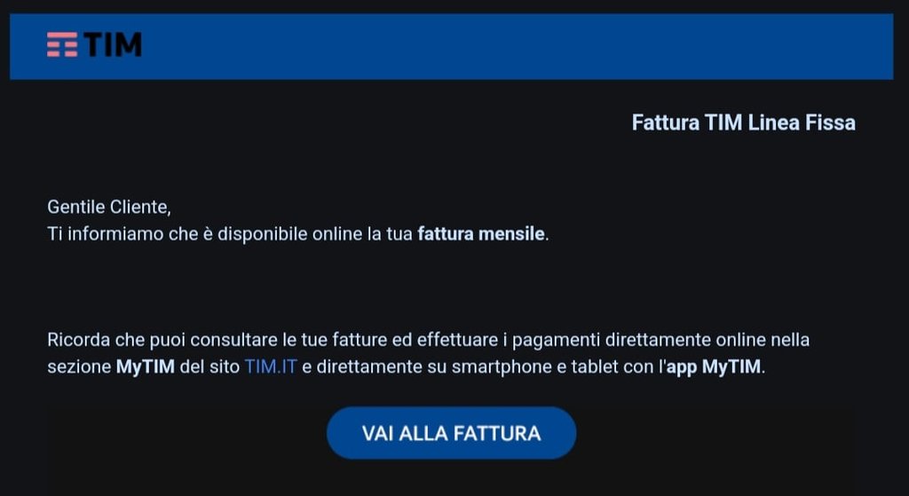 Anch'io ho scelto di non ricevere più la fattura cartacea, e da area clienti ho messo ricezione fattura via email con pdf, ma le fatture non mi arrivano mai in questo modo. Mi arriva sempre e solo la notifica di emissione fattura tramite mail ma mai con il relativo pdf, pur avendolo selezionato. Quindi pago direttamente dallo smartphome scaricando la fattura da area clienti. Non capisco se questa cosa capiti solo a me. Poco male, visto che la fattura la trovo lo stesso in area clienti, ma mi sembra alquanto strano. Come vedi, nessun accenno al pdf, cliccando su 'vai alla fattura' mi rimanda all'app, che non mi interessa. Ho controllato, nessuma mail spam. Questa è l'unica mail che mi arriva ogni mese. Succede anche a voi? Sarà forse perchè non ho la domiciliazione delle fatture attiva e pago sempre al tabacchi?