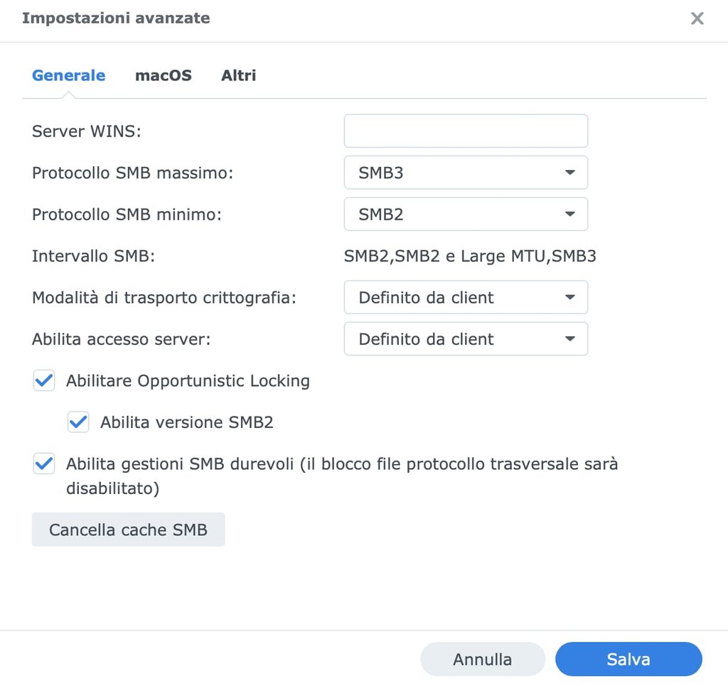 Io ho un DS214play, modello (al tempo) intermedio della gamma ma precedente al tuo, per cui ti lascio le impostazioni con cui l'ho configurato: non mi creano problemi di velocità da anni sia su Windows che macOS; puoi fare un tentativo e vedere come va.