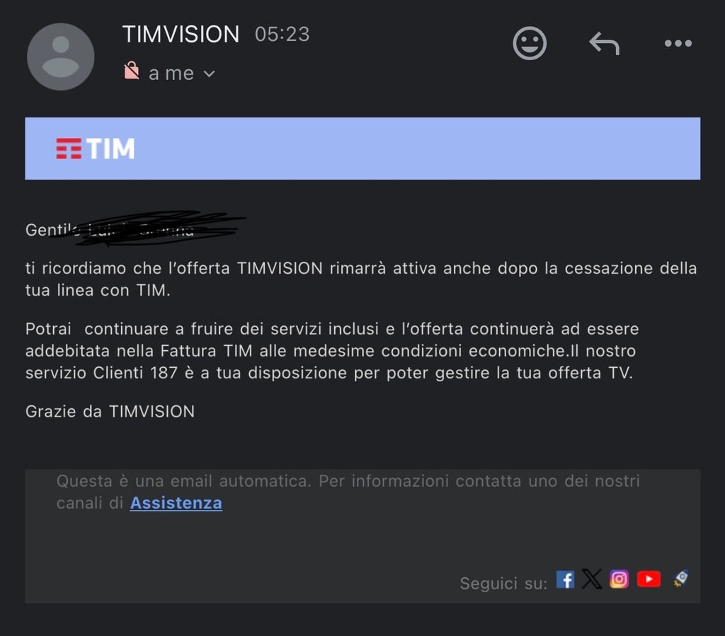Buongiorno, dopo aver attivato Eolo100 ho prontamente proceduto a richiedere la portabilità del numero fisso, portabilità che dovrebbe concludersi oggi ma che ancora prima di un esito positivo (da area Eolo risulta interrotta per codice errato, nonostante abbia aperto ticket, mandato la bolletta e ricevuto conferma che sarebbe avvenuta oggi) mi arrivano mail ad sms per dirmi che il servizio timvision sarebbe rimasto attivo anche dopo la cessazione della linea, che da account Tim risulta cessata…