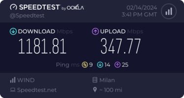 Dopo alcuni speedtest sottotono, apparentemente dovuti a problemi di driver [1] [2] (che incubo...) ho installatto il FW 1.45 per la NIC ed il driver 1.0.1.4, ottimizzato i parametri TCP con il solito TCP Optimizer ed ho cambiato il solito parametro di Velocità/Duplex da "Auto Negotiation" a "2.5 Gbps Full Duplex".