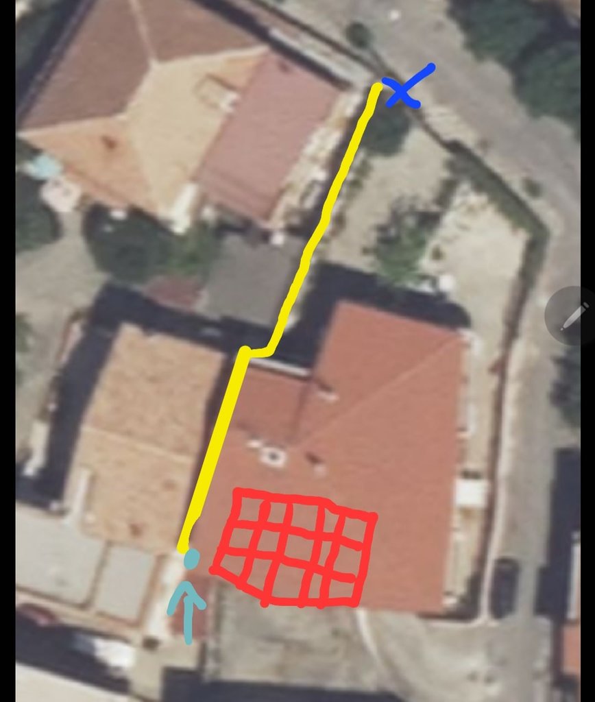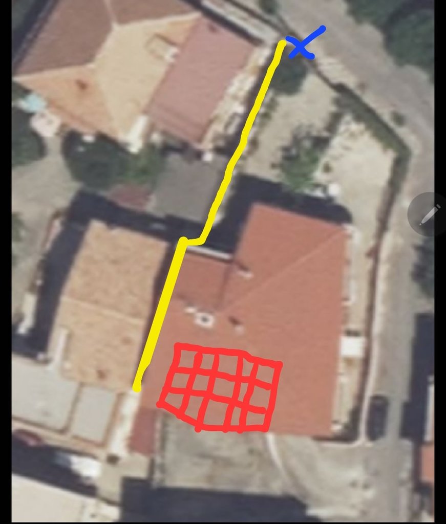 La X blu indica la posizione del contatore di E-Distribuzione. In questa soluzione avevo pensato di far scendere i cavi dal pannello lungo la verticale dell'abitazione e poi costeggiare l'immobile fino alla X blu dove potrei far realizzare una nicchia o una piccola struttura in mattoni (ovviamente chiusa e coibentati) per mettere inverter e quadro. Dal pannello alla X blu però ci vorranno un 40 metri di cavo e quindi non so se è tecnicamente possibile.