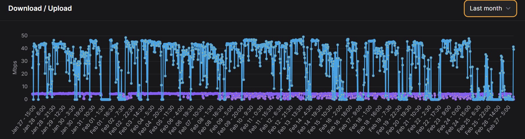 Per ottenere dati più seri, ho anche installato su un Raspberry (collegato con cavo CAT6E) una piccola utility che fa gli speedtest automaticamente, e questo è uno screenshot delle velocità nell'ultimo mese. Ogni volta che si vede un punto a 0 (o quasi) c'è stato un riavvio del modem. Se è prolungato, o è perché non ero a casa, o stavo aspettando una risposta dai tecnici Fastweb.