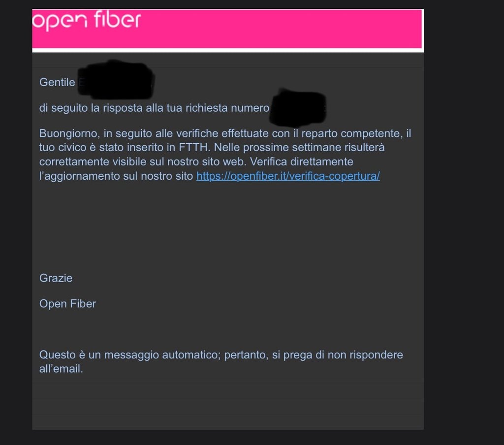 vi scrivo perché nel quartiere dei miei suoceri a Genova è stata completata la rete FTTH da openfiber. Tutti i civici dei condomini della via sono stati connessi da anni (5 o 6) tranne la casa bifamiliare su cui sono stati solo installati i tubi.