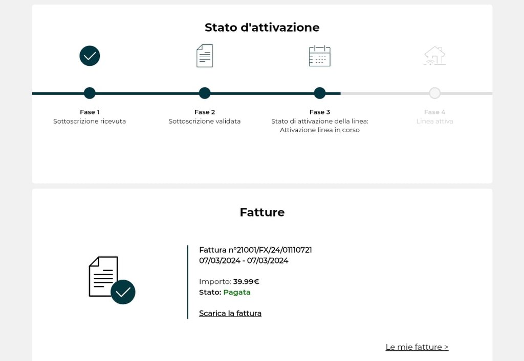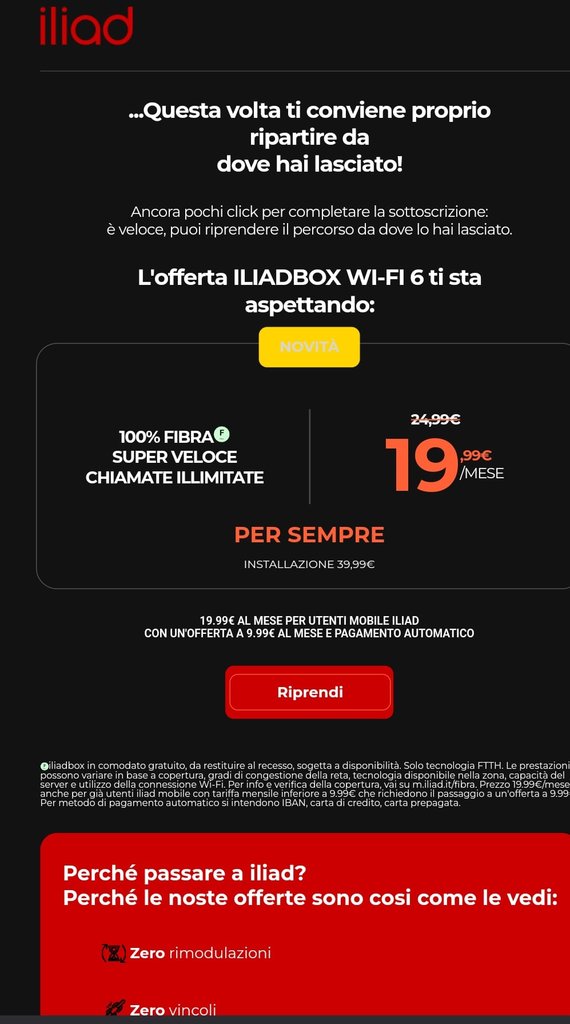Ragazzi ho un dubbio sull'attivazione dell'offerta fibra con iliadbox. Giorno 5 Marzo ho tutto quello che c'era da fare sul sito. Ho pagato i 39€ per l'attivazione inserito i dati ecc. Sto aspettando che mi chiamino per la presa appuntamento del tecnico. Stamattina 7 marzo mi arriva una mail con scritto "riprendi", il quale mi riporta nel sito iliad per caricare nuovamente i documenti d'identita, poi continuare nello step successivo e pagare, cosa che ho già fatto. Infatti nel mio profilo Iliad l'avanzamento è sul punto di attesa di attivazione in attesa della migrazione, non dovrebbe chiedermi di rifare quei passaggi. Com'è possibile?