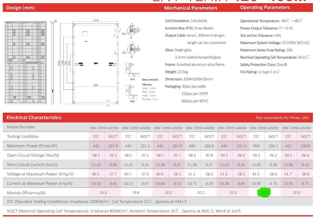 Un longhi da 450W è di dimensione di 2094x1038mm (cioè 2.1 metri per 1.0 metri) con 1000W/m2 ha 20.7 di efficenza
