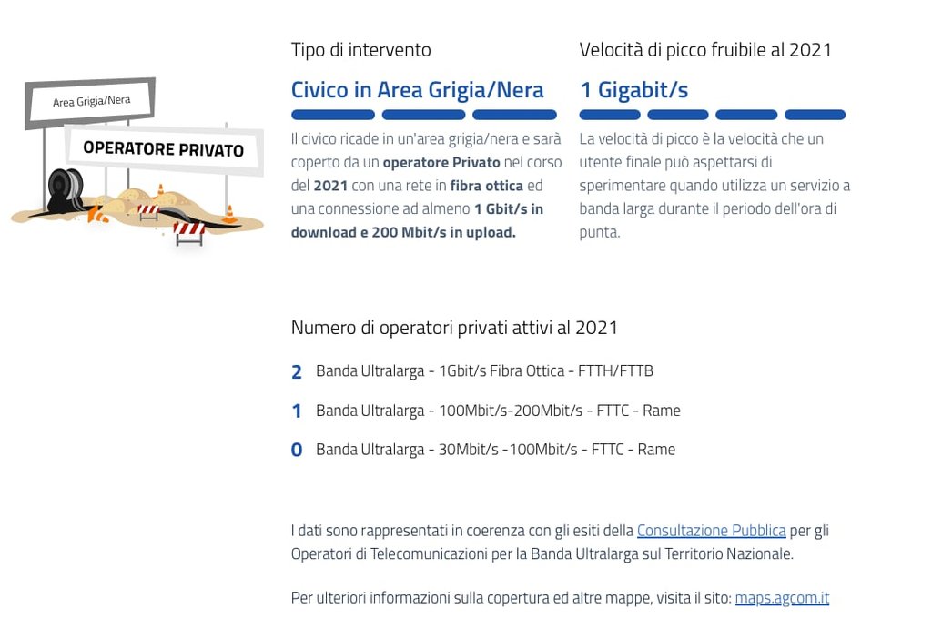 Secondo bandaultralarga.italia.it il civico dal 2021 sembrerebbe coperto da 2 operatori privati con picco di 1 Gbps.