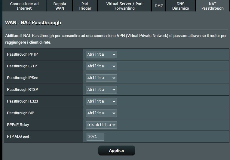 Le impostazioni NAT sono tutte impostazioni predefinite
