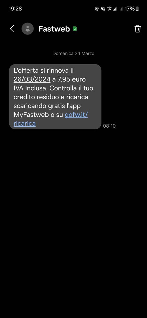 👇 Ecco l'sms di rinnovo di un'offerta con ricarica manuale (dove ovviamente non si fa nessuna menzione del conto fastweb).
