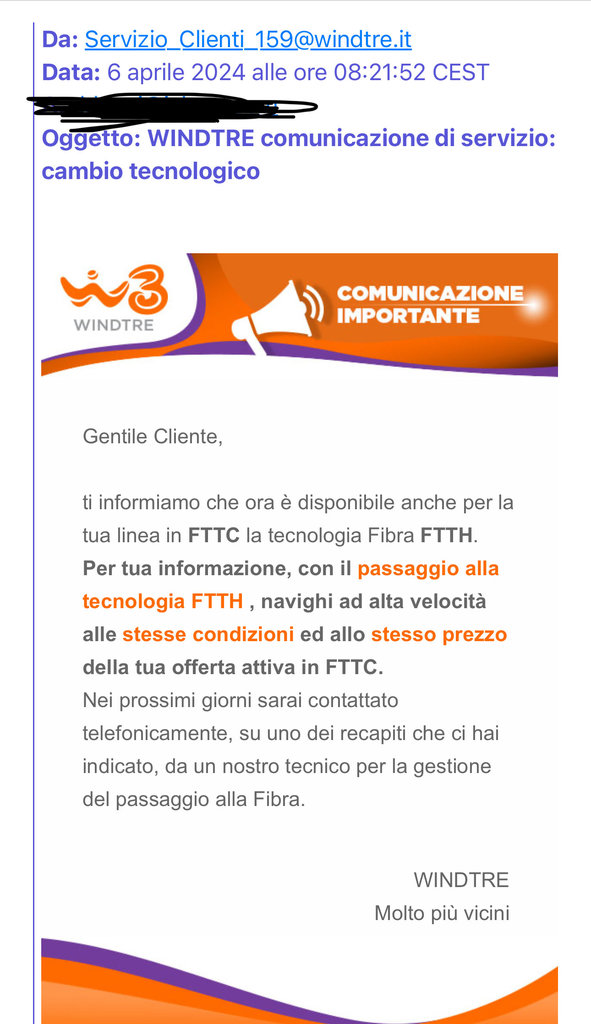 Per l’ennesima volta il mio attuale operatore WIND mi comunica l’arrivo della FTTH su rete OF ma anche stavolta in fase di presa appuntamento per l’uscita del tecnico, annullano tutto perché il call center non vede disponibilità del servizio.