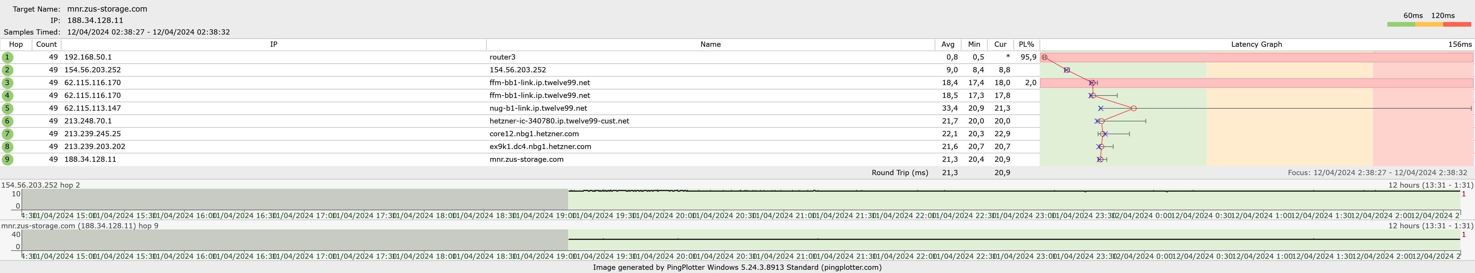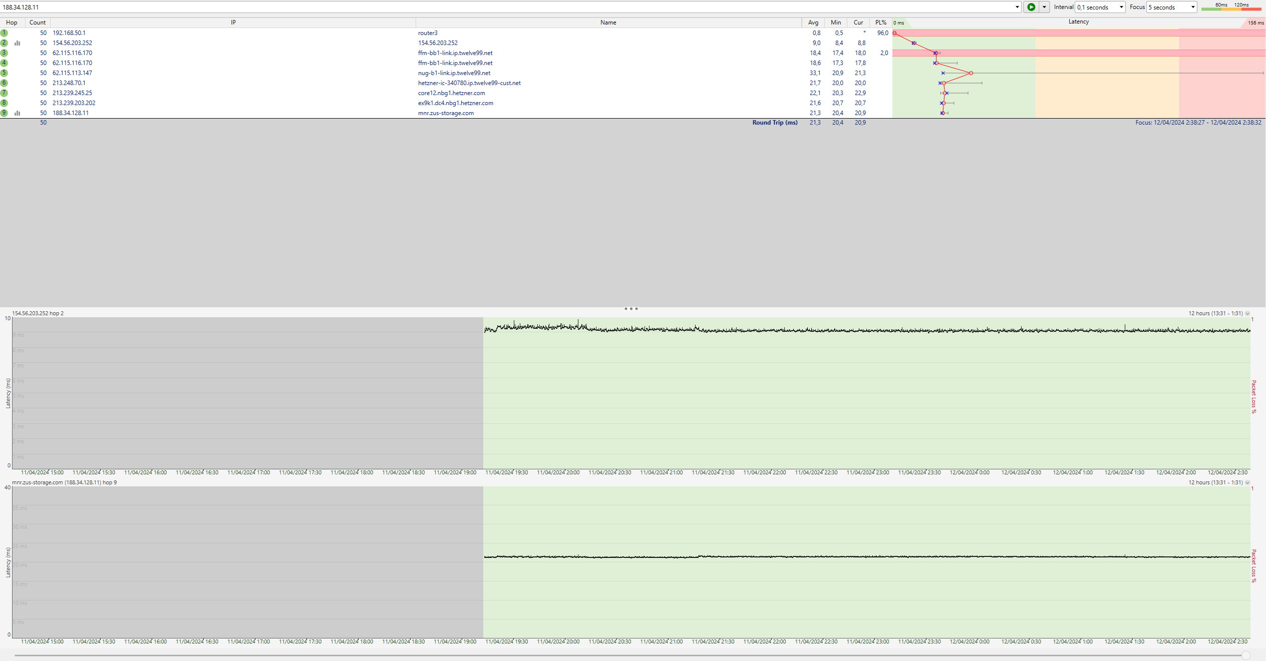 Effettivamente si ha una perdita. Vi lascio il link della misura, cosi potete vedere in realtime la misura, fino al 16 di aprile rimarrà attiva. https://atlas.ripe.net/measurements/69900168#latencymon