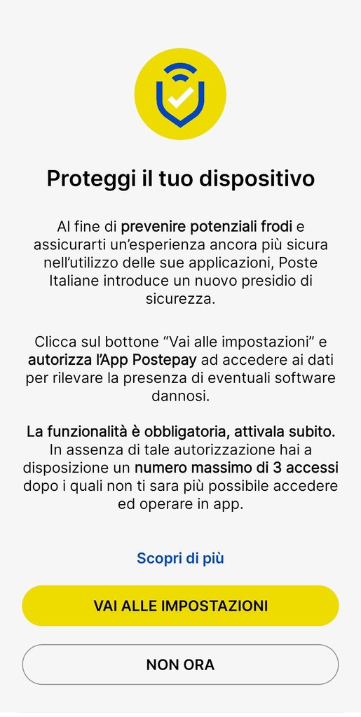 handymenny Belzebu69 I termini e condizioni dell'app puntano a queste pagine: https://www.poste.it/informativa-privacy-app.html https://www.poste.it/applicazione-postepay.html#documentazione Lo scopri di più a questa: https://www.poste.it/psd2-e-sicurezza---come-difendersi-dalle-truffe.html Dove invitano ad attivare "la funzionalità anti-malware"
