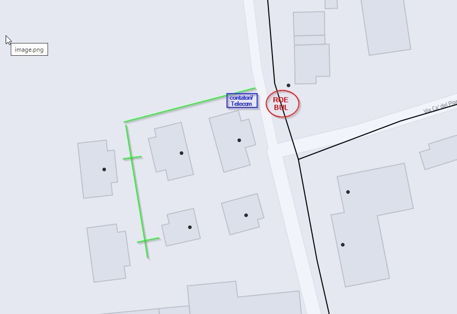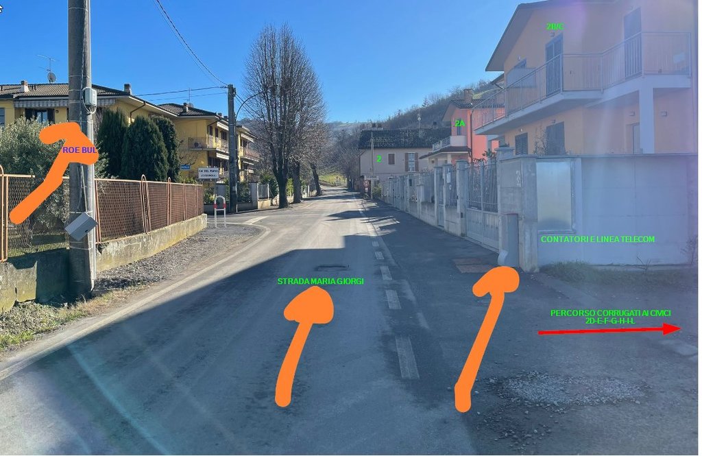 A gennaio ho stipulato un contratto con Tiscali, e l'operatore mi ha assegnato al civico più vicino per attivare l'offerta (io abito al 2/H, ma censito dai provider è presente solo il 2). Dopo qualche settimana, ricevo una telefonata che mi informava che il tecnico era fuori da casa per verificare la fattibilità dell'intervento. Il ROE si trova sulla strada pubblica, e sul lato opposto c'è la colonnina telecom e i contatori, dai quali parte il percorso privato indicato poco fa. Il tecnico ha dato l'ok a patto che venga effettuato un taglio per attraversare la strada e quindi raggiungere l'inizio del percorso privato.