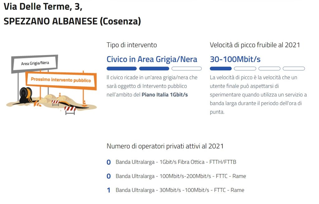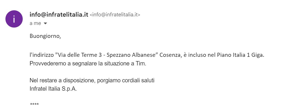 Nunu00 Buonasera, dall'ultimo aggiornamento del sito Connetti Italia è scomparso anche il mio civico. Sul sito BUL continua ad essere presente e risulta tra quelli del Piano Italia 1 Giga Tra l'altro qualche mese fa avevo contattato Infratel poichè sul sito di Tim pianoitalia1giga il civico risultava inesistente e loro mi avevano risposto in questo modo Cosa devo aspettarmi, verrò mai coperto?