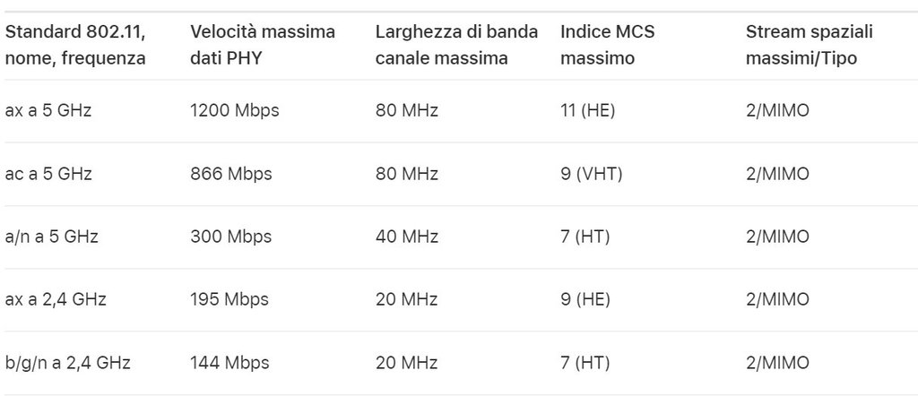 Dal sito di Apple ti linko la tabella degli standard WiFi che il tuo IPhone 13 supporta: