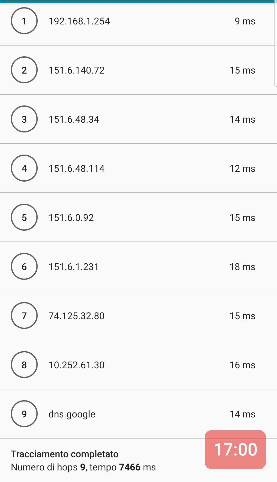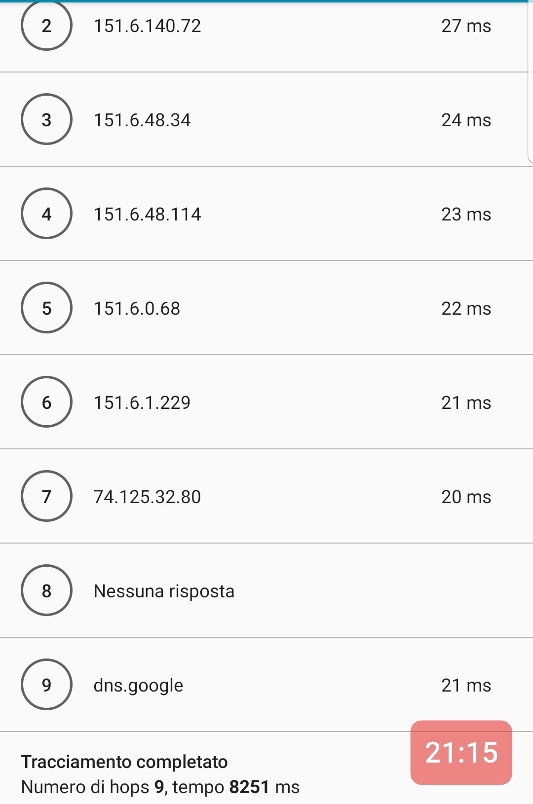 Edoardo86 Per fare una fotografia della situazione ADSL, finché sono ancora collegato in rame.. Ho fatto un trace alle 17:00 e uno alle 21:15. Rispetto alla FTTH, la latenza è sempre buona, è solo sparito il server 8 che non sono riuscito a localizzare.