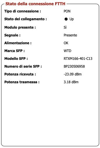 TheMarsican ti lascio qui gli screenshot, la potenza al momento è -23.09 dBm ricevuta e 3.2 dBm inviata (oscilla intorno a questi valori)