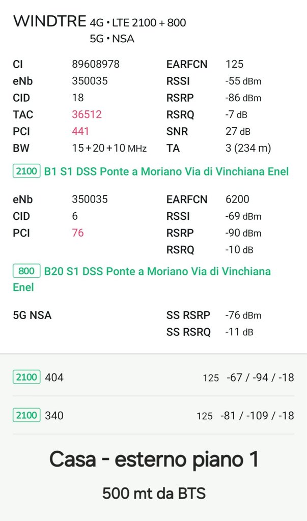 Ho un modem Huawei B535-232, collegato a una BTS che si trova a 500 metri da casa mia, nella centrale idroelettrica Enel. La BTS trasmette su B1+B3(20MHz)+B20 (sia 4G che 5G NSA).