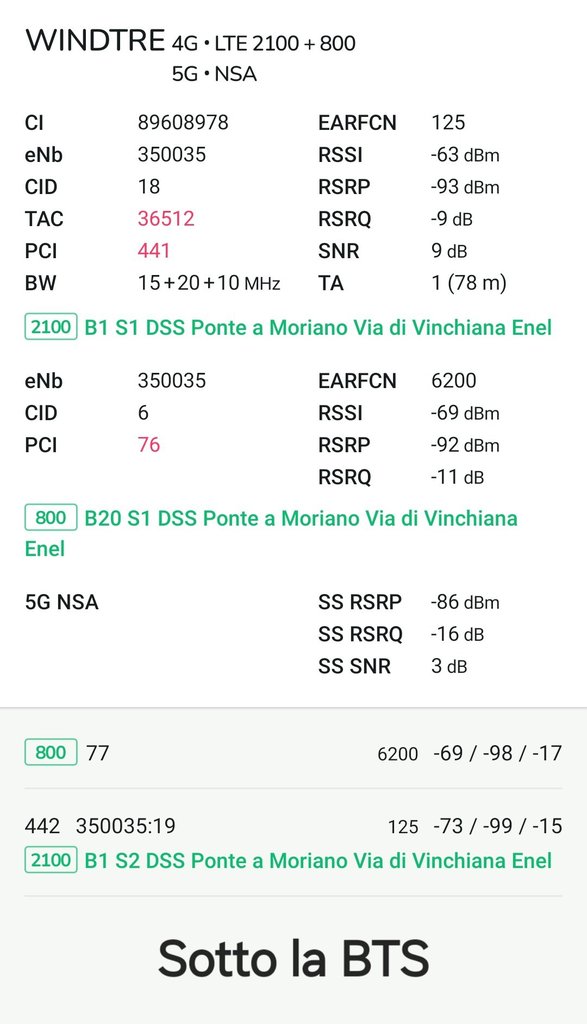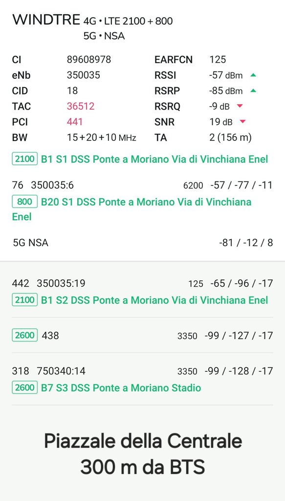Il dubbio che ho è sul il valore RSRP, che anche vicino alle antenne non scende mai sotto -89 / -90 dBm. Non è un valore troppo basso per essere a poche centinaia di metri dalla BTS?