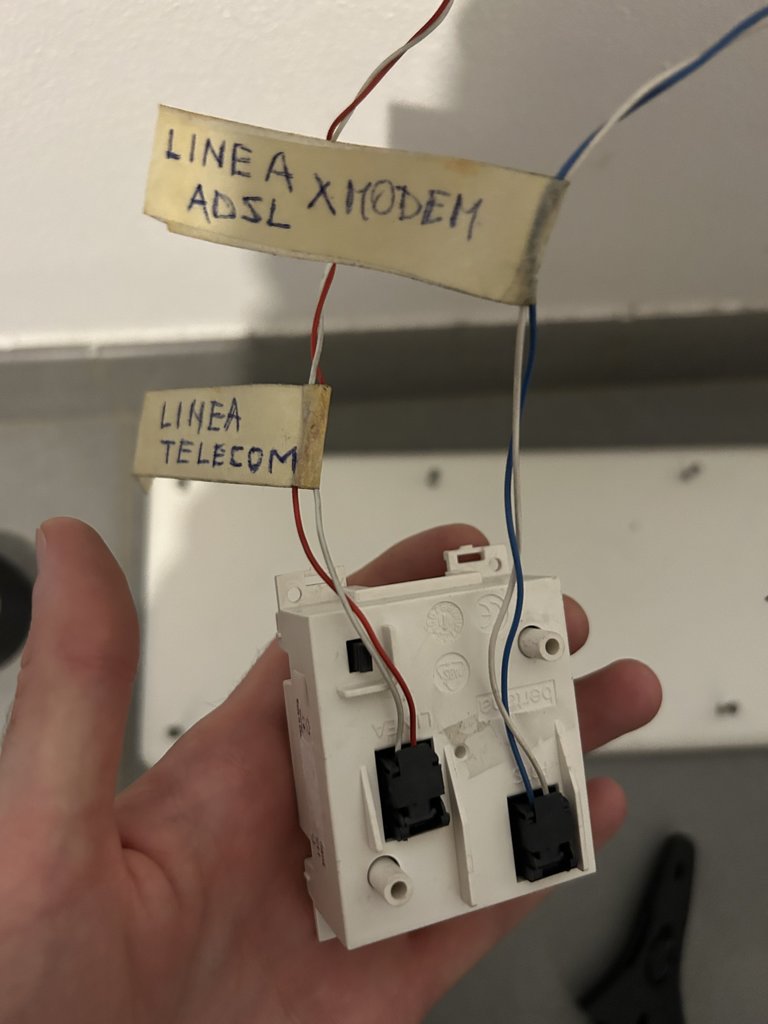 Dal modem uscita linea 1 si collega a presa con cavo bianco e rosso (non è lo stesso della linea Telecom del piano inferiore) che porta la linea telefonica a tutte le prese di casa (piano inferiore e superiore)